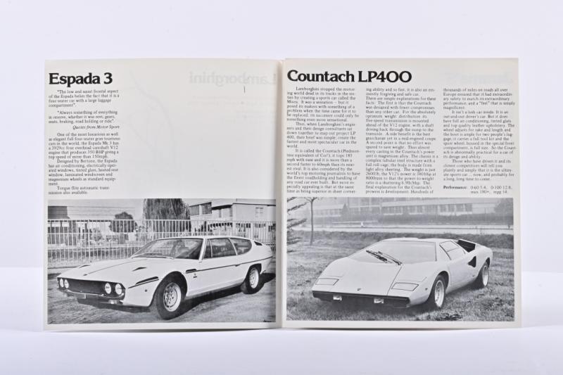 Lot 412 of 573: LAMBORGHINI: Two interesting Lamborghini sale items. 1970's Berlinetta Italia Ltd., (Concessionaires) Espada 3, Urraco P300, Jarama 'S', Countach LP400 model brochure