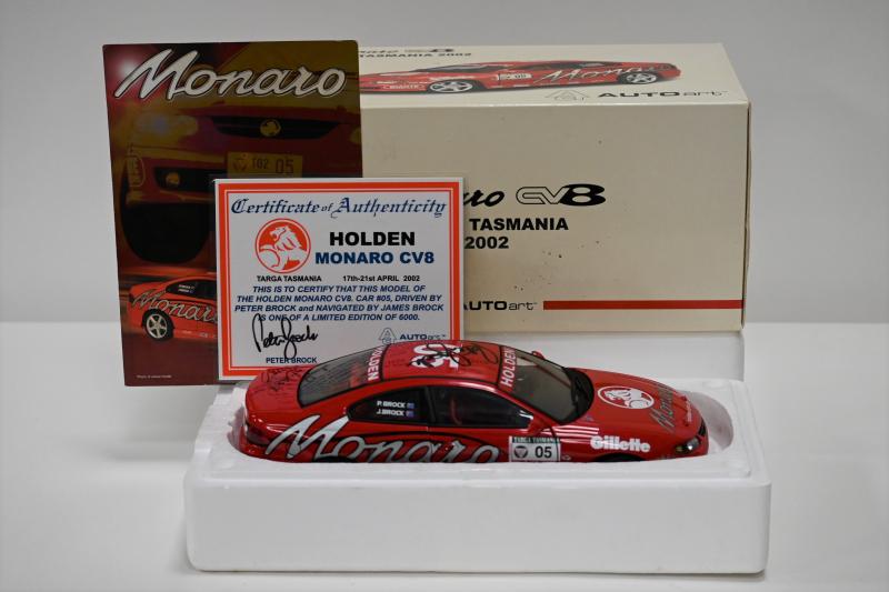 Lot 207 of 494: MONARO: A 1:18 scale Autoart Holden Monaro CV8 as raced by Peter Brock/James Brock in Targa Tasmania 2003, #05, roof signed by Peter Brock and trunk signed by James Brock, with a copy of the COA numbered 2752/6000, in fitted box, faded box (SALEROOM NOTICE)