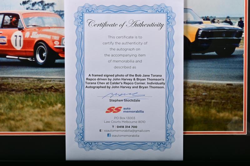 Lot 21 of 566: HOLDEN: A framed photograph of Bob Jane Torana Repco as driven by John Harvey and Bryan Thomson's Torana Chev at Calder's Repco Corner. John Harvey and Bryan Thomson signatures