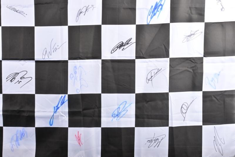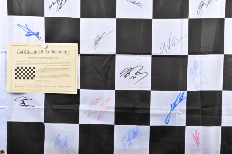Lot 39 of 566: CHEQUERED FINISH LINE FLAG: An exceptional Formula One chequered finish line flag with COA, autographed by Michael Schumacher, Mark Webber, David Coulthard and 27 F1 personalities (30 signatures in total) 1520x900mm
