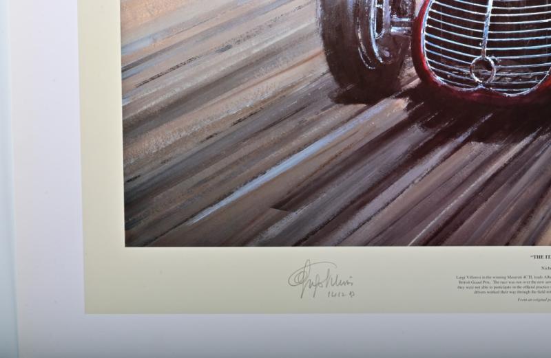 Lot 99 of 566: MASERATI: A Limited Edition print by Nicholas Watts titled "THE ITALIAN JOB" featuring the winning Maserati 4CLT as raced to victory by Luigi Villoresi at the 1948 British Grand Prix, Silverstone. Signed by Luigi Villoresi and artist. Numbered 400/500