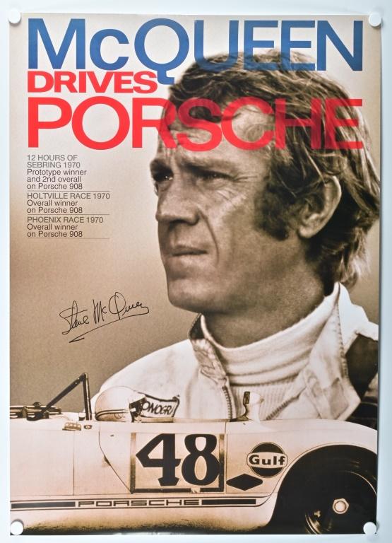 Lot 418 of 566: McQUEEN/PORSCHE: A 'McQUEEN DRIVES PORSCHE' poster depicting Steve McQueen and a Porsche 908