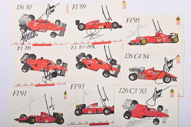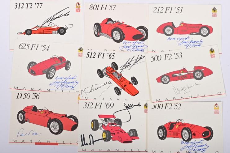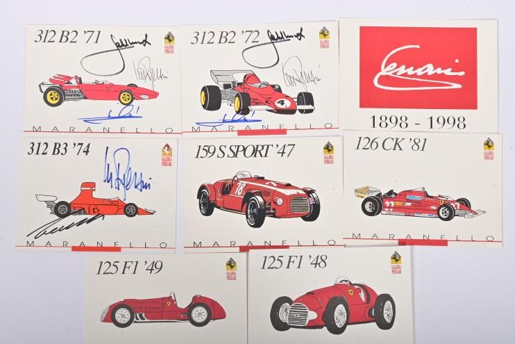 Lot 1 of 484: FERRARI: A set of 'Ferrari 1898 - 1998' postcards from Galleria Ferrari depicting a myriad of Ferrari race cars from '159 S SPORT' 47' to 'F1 '95'. Various Ferrari driver signatures including Jose Froilan Gonzalez, Paul Frere, Nino Vaccarella, Chris Amon, Jacky Ickx, Niki Lauda, Rene Arnoux, Gerhard Berger, Jean Alesi