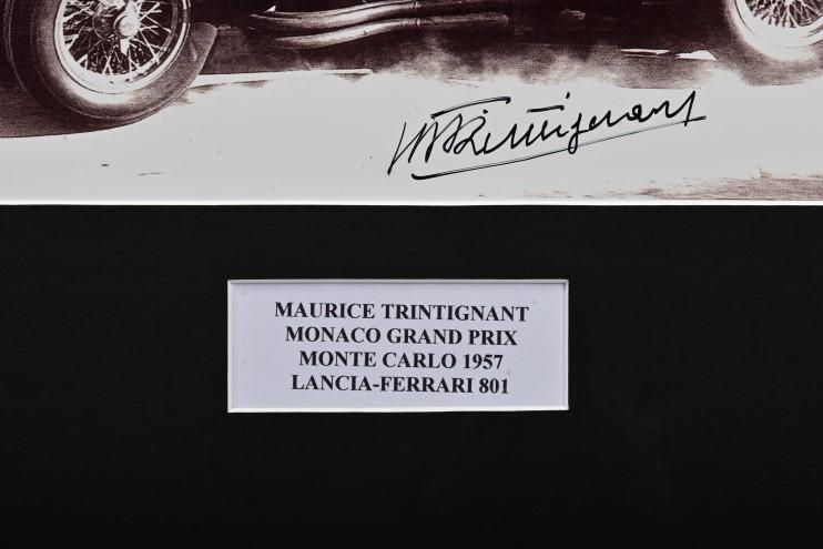 Lot 22 of 484: TRINTIGNANT: A black and white picture of Maurice Trintignant racing a Lancia-Ferrari 801 at the MONACO GRAND PRIX, MONTE CARLO 1957. Picture signed by Maurice Trintignant
