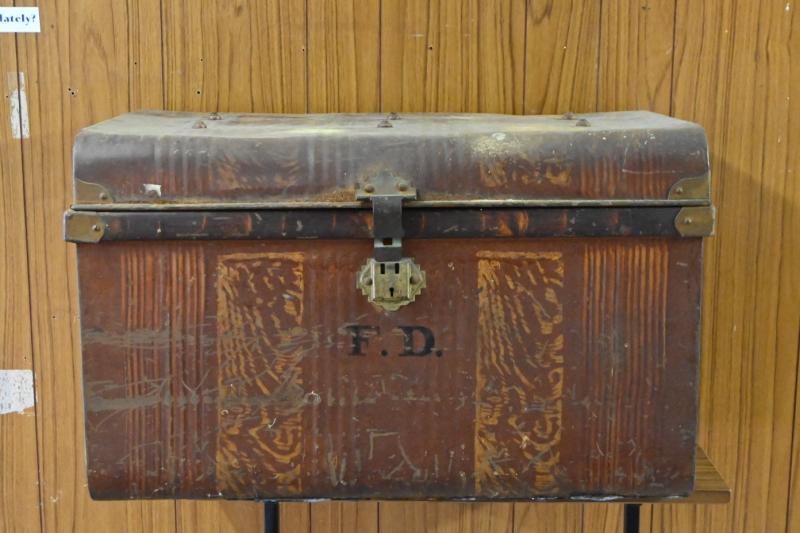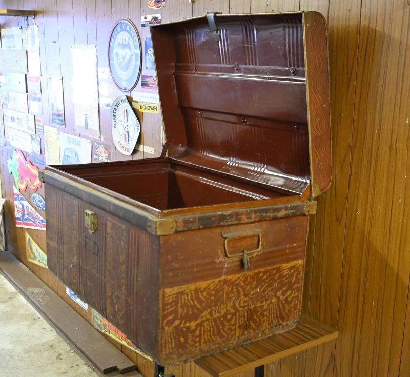Lot 50 of 371: TRUNK: A larger circa 1950s metal steamer truck, with the initials on front "F.D", latch later, 43.5cm high x 71cm wide x 47cm deep