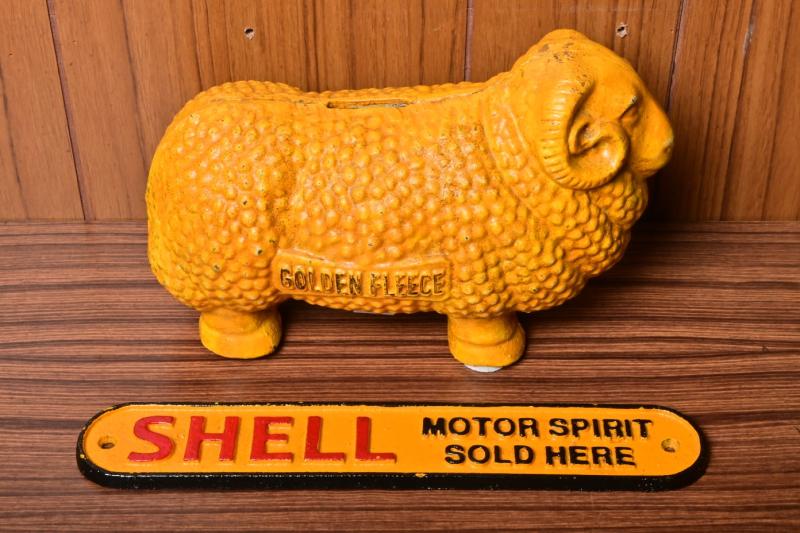 Lot 55 of 371: GOLDEN FLEECE/SHELL: Two cast iron reproduction items including a Golden Fleece ram money box, 16cm high x 25cm wide