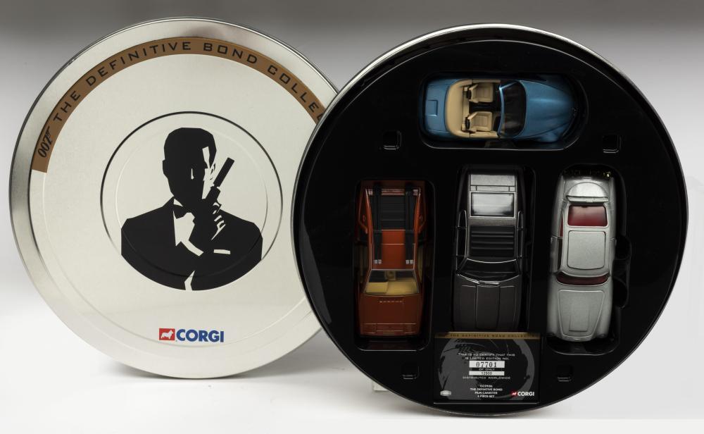 Lot 117 of 499: JAMES BOND: A NOS 1:36 scale Corgi "The Definitive Bond Film Canister" 4 piece set comprising Lotus Esprit Turbo, BMW Z3 Roadster, Aston Martin V8 & Aston Martin DB5 die-cast models contained in a film canister