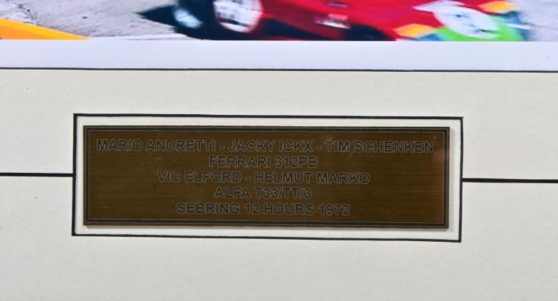 Lot 60 of 127: SEBRING: A colour picture from Sebring 12 Hours 1972 of Mario Andretti/Jacky Ickx/Tim Schenken racing a Ferrari 312PB & Vic Elford,/Helmut Marko racing a Alfa T33/TT/3. Picture signed by all drivers