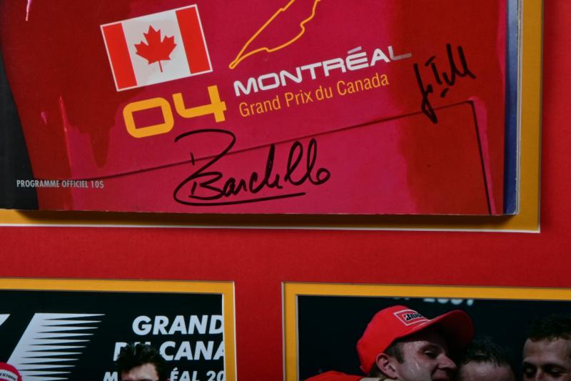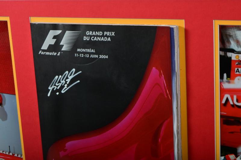Lot 90 of 127: CANADIAN GRAND PRIX: A superb colour picture collage from the 2004 Canadian Grand Prix featuring window mounted pictures of the winning Ferrari F2004 and Ferrari team. With centrally mounted 'GRAND PRIX DU CANADA, MONTREAL 11-12-13 JUIN 2004' Official Programme. Official Programme with Michael Schumacher, Rubens Barrichello, Jean Todt signatures