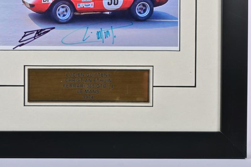 Lot 105 of 127: GUITTENY/ETHUIN: A colour picture of Lucien Guitteny/Christian Ethuin racing a Ferrari 365 GTB/4 at Le Mans 1974. Picture signed by both drivers