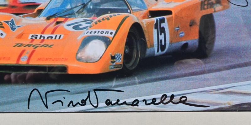 Lot 108 of 127: VACCARELLA/JUNCADELLA: A colour picture of Nino Vaccarella/Jose Juncadella racing a Ferrari 512 M at Le Mans 1971. Picture signed by both drivers