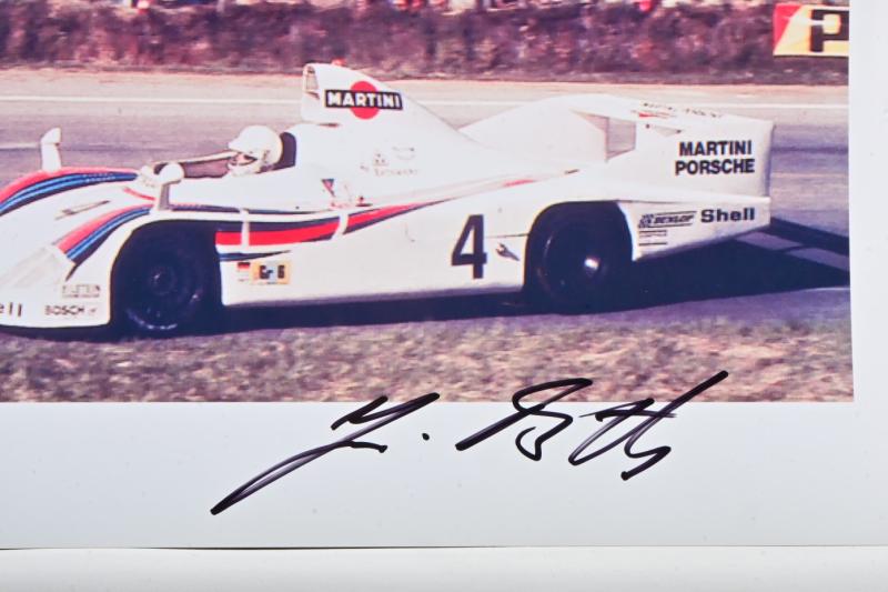 Lot 674 of 501: PORSCHE: A colour picture of the Martini Porsche 936 from Le Mans 1977 as raced by Jurgen Barth, Hurley Haywood, Jacky Ickx. Jurgen Barth & Hurley Haywood signatures