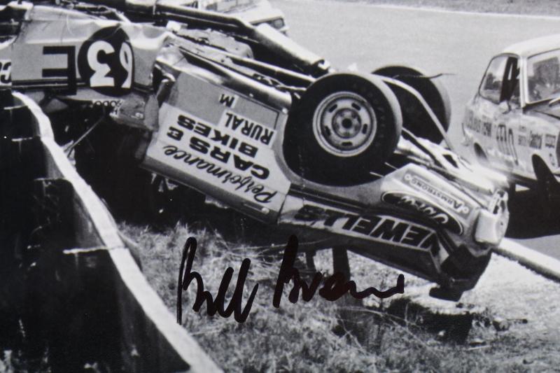 Lot 910 of 501: BROWN: A black and white picture of Bill Brown's GT-HO PHASE 3 FALCON accident at Bathurst 1971, picture signed by Bill Brown