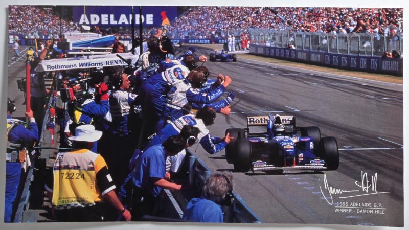 Lot 730 of 503: POSTER: A NOS Poster of the 1995 Adelaide Formula 1 Grand Prix Winner Damon Hill crossing the finish line W60cm x H33cm