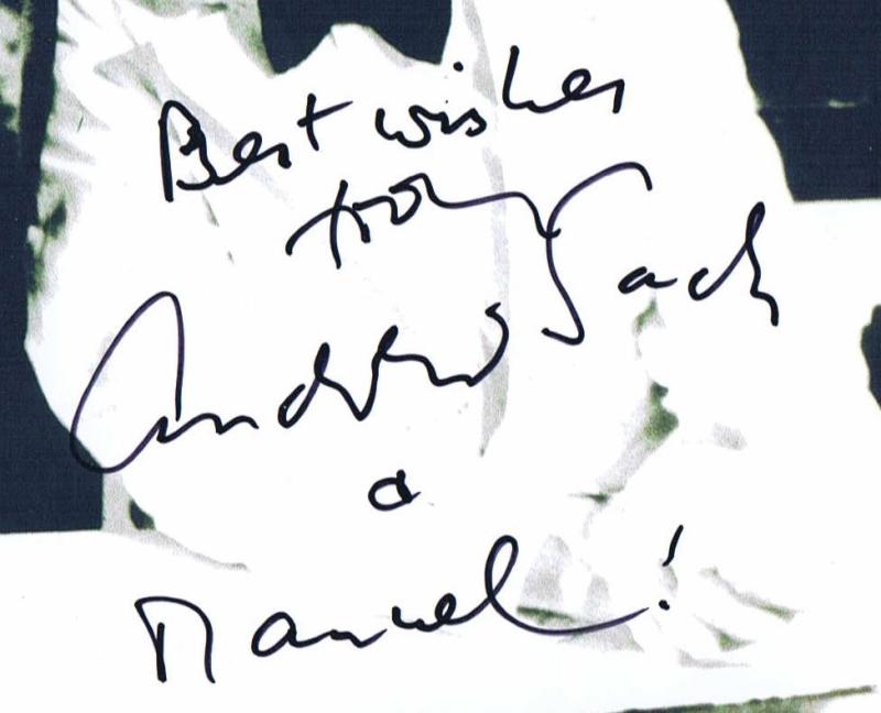 Lot 310 of 345: FAWLTY TOWERS: A black and white picture from Fawlty Towers, autographed by Andrew Sachs in black marker, 25.5cm wide, 20cm high