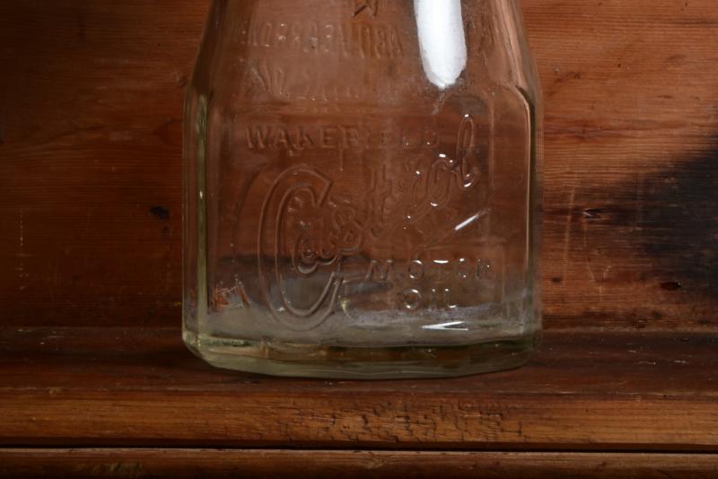 Lot 27 of 501: CASTROL: A 1940/50s "Castrol" embossed one imperial pint oil bottle, with late 20th century "Castrol 30-40MS" tin pourer and dust cover