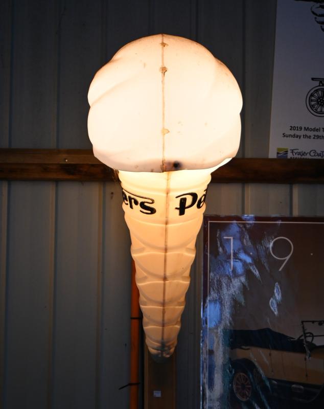 Lot 68 of 501: PETERS: An original wall mounted illuminated "Peter's" ice cream cone, 83cm high, 37cm wide, 56cm deep