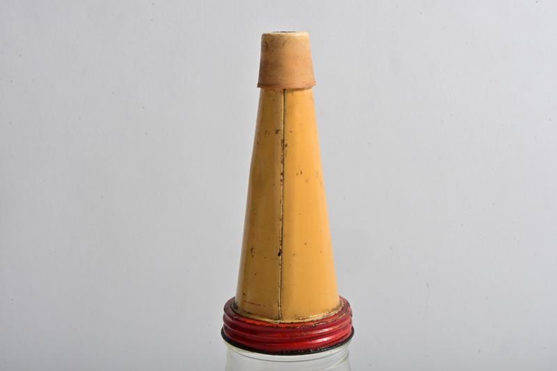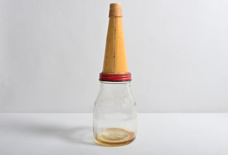 Lot 682 of 386: SHELL: A one imperial pint oil bottle, with 1950/60s "Shell X-100 Motor Oil" tin pourer and later plastic dust cover