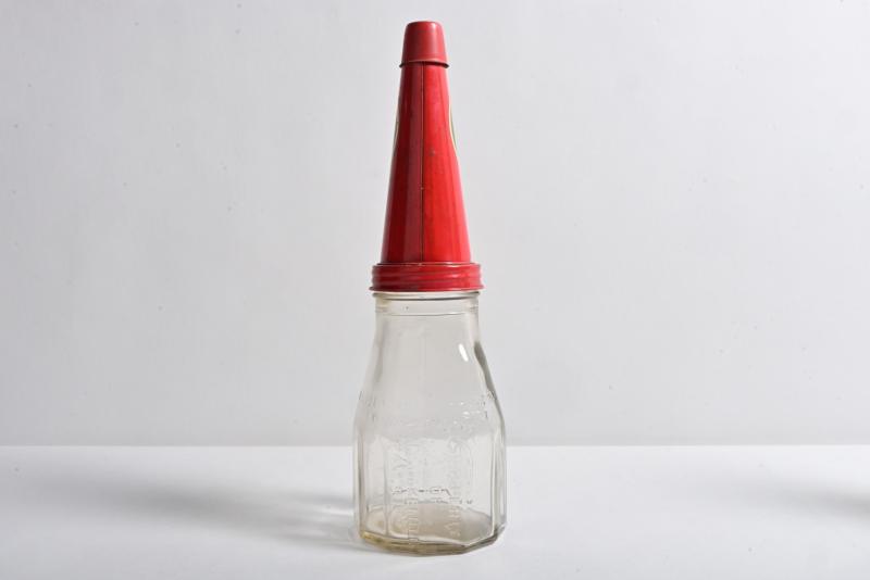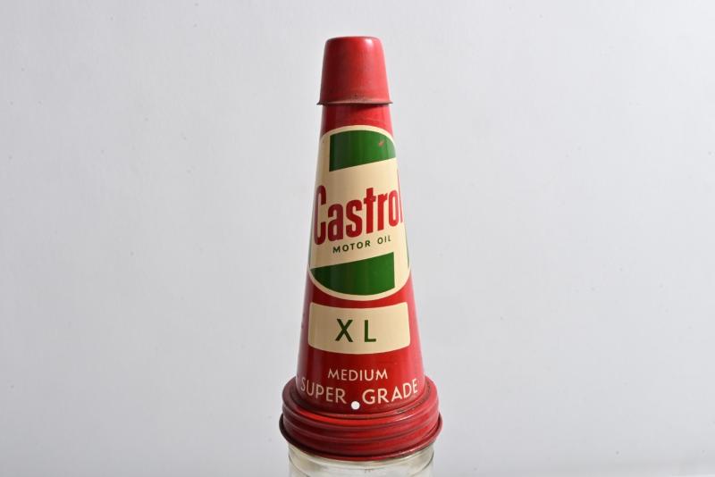 Lot 827 of 386: CASTROL: A circa 1940/50s "Castrol Wakefield" embossed one imperial pint bottle, with circa 1960s "Castrol XL Medium Super Grade" tin pourer and dust cover