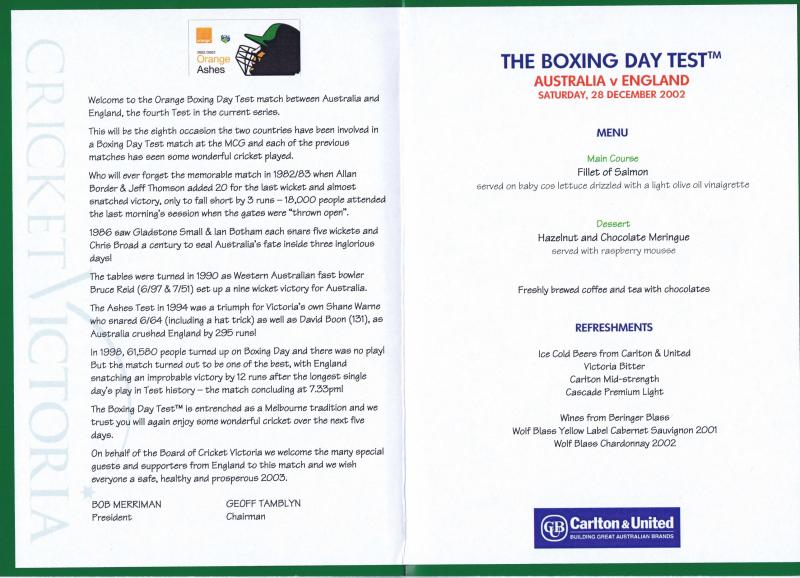 Lot 7 of 388: TEST CRICKET: A corporate seating menu from the Boxing Day Test 2002, autographed by Ricky Ponting, Jason Gillespie and Shane Warne on front cover