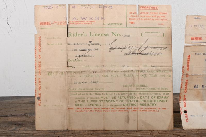 Lot 124 of 351: DRIVERS LICENSES: Three early drivers/riders licences from Arthur W. Evans, 1920s/1930s