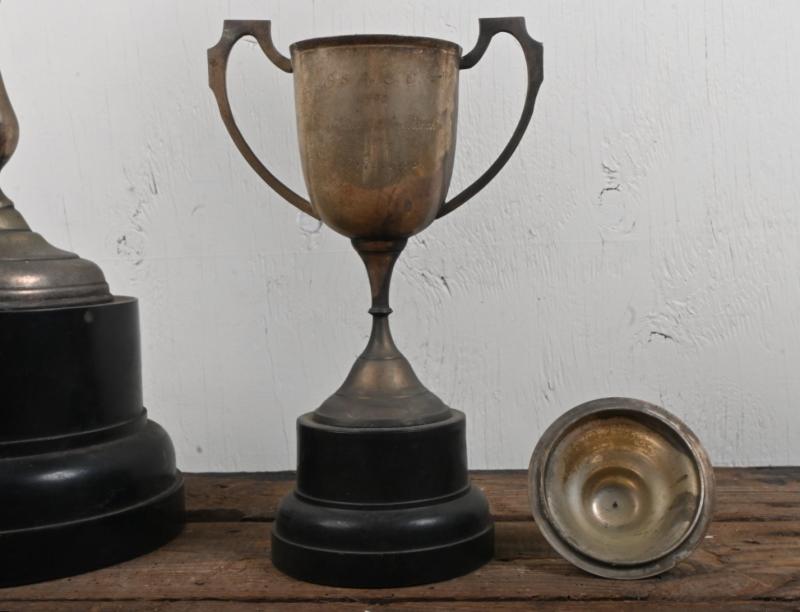 Lot 154 of 351: TROPHY: Two silverplate trophies on Bakelite stands won by F. Conceicao, the larger inscribed "Dia De Portugal, De Camores, & Das Comunidades Portuguesas, 1981, Ciclismo" the other "E.S.A.C.C. 1993, Veteran Road Championship, 1st, F. Conceicao