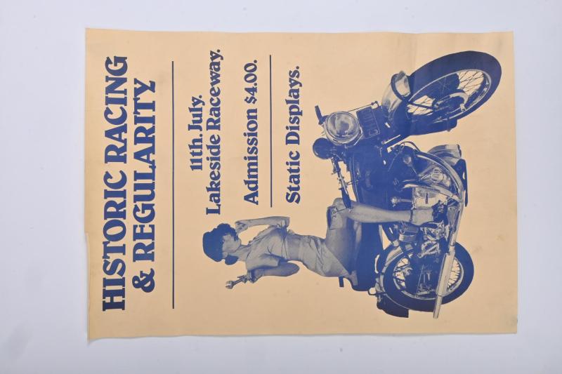 Lot 520 of 435: LAKESIDE: An original advertising poster for the "Historic Racing and Regularity" race, featuring a Chiko Roll style lady on a motorcycle, 11 July, 42 x 30cm