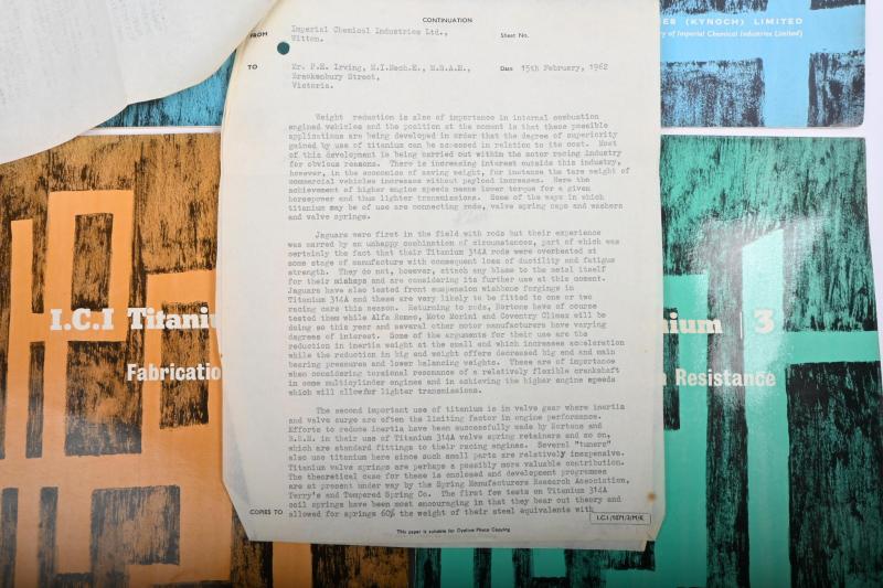 Lot 658 of 435: IRVING/TITANIUM/MAGNESIUM: A group of documents related to magnesium and titanium as requested by Phil Irving for research. Hand written document by Irving - 'What Can We Do with Misc Exotic Materials'