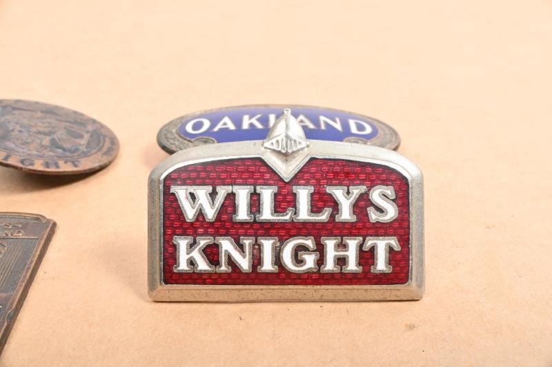 Lot 83 of 586: WILLYS/ OAKLAND/KNIGHT: Four badges including a enameled Oakland badge, a Willys Knight badge a Willys Overland 'Whippet Four' badge and a Falcon Knight badge