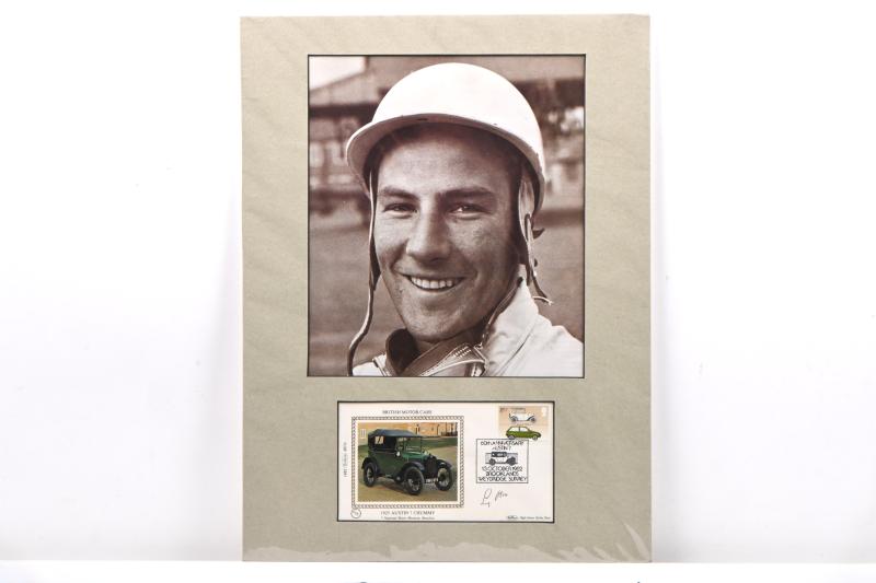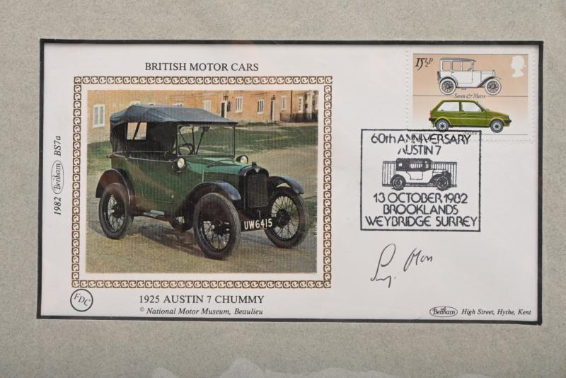 Lot 842 of 557: MOSS: A 1982 BRITISH MOTOR CARS First Day Cover featuring a colour picture of a 1925 AUSTIN 7 CHUMMY and Seven & Metro/Austin stamp. First Day Cover signed by Stirling Moss