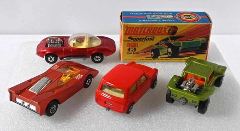 Lot 126 of 564: MATCHBOX: Four 1970's MATCHBOX Superfast models. Boxed No.13 BAJA BUGGY in lime green