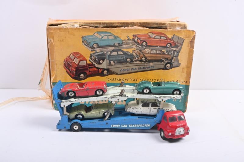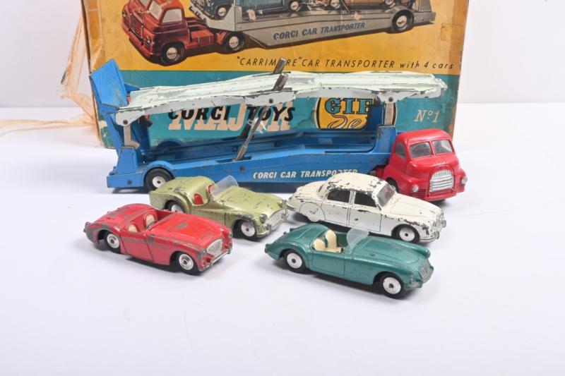 Lot 100B of 564: CARRIMORE CAR TRANSPORTER: Corgi GS1 Gift Set. Carrying load of No.208 Jaguar 2.4 Litre, No.300 Austin Healey Sports Car, No.302 MGA sports car & No.305 Triumph TR3 Sports Car