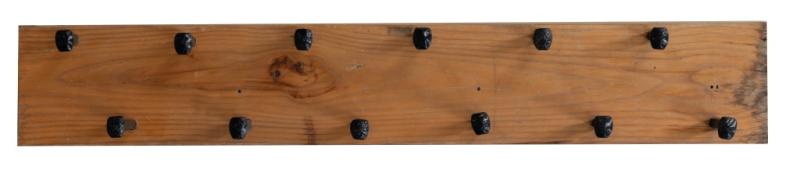 Lot 264 of 417: RAILWAYANA: A interesting coat rack made using railway spikes, mounted to timber measuring 147cm long, 24cm wide.