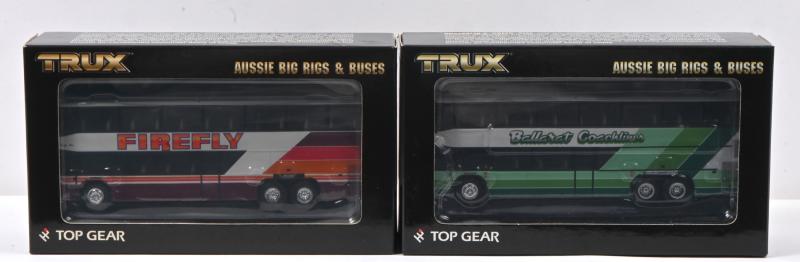 Lot 376 of 389: DENNING: Two 1:76 scale TRUX 'AUSSIE BIG RIGS & BUSES' 1988 Denning models. TX09B in 'FIREFLY' & TX9F 'Ballarat Coachlines' liveries