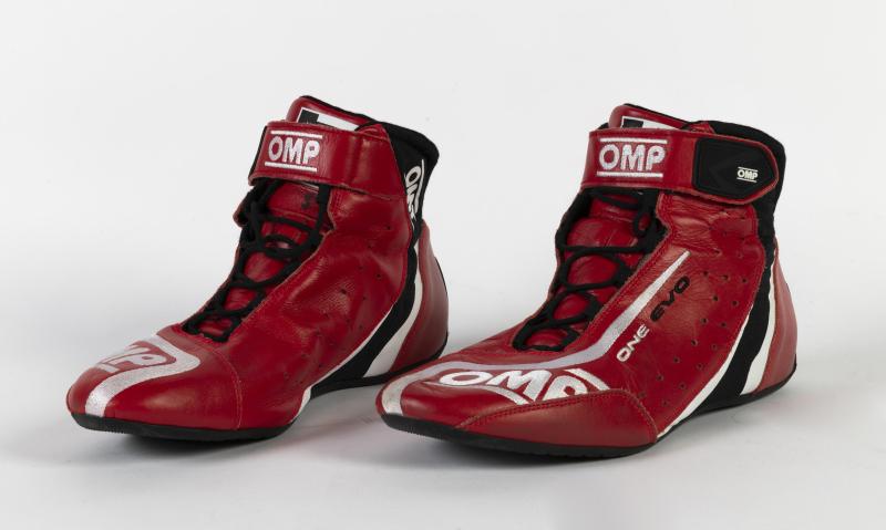 Lot 37 of 61: PREMAT: A pair of red OMP 'ONE EVO' racing boots as worn by Alex Premat during the 2018 Virgin Australia Supercars Championship for DJR Team Penske, Shell V-Power Racing Team. CoA hand signed by Dick Johnson & Dr Ryan Story