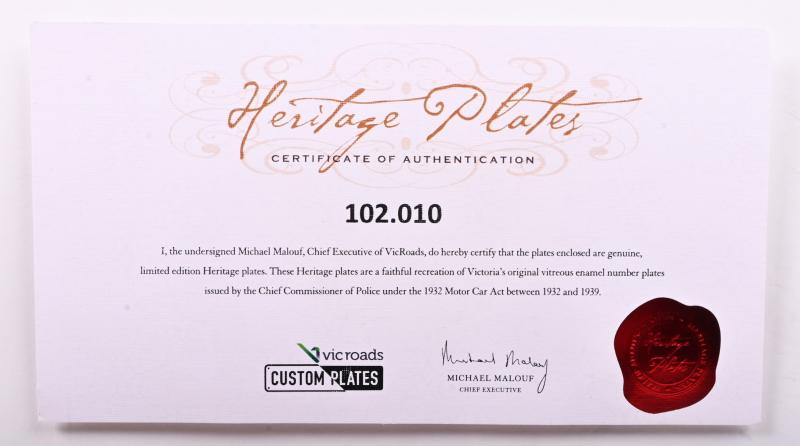 Lot 17 of 72: Six digit Victorian heritage enameled plates '102-010', sold with rights to display [Location: Melbourne]