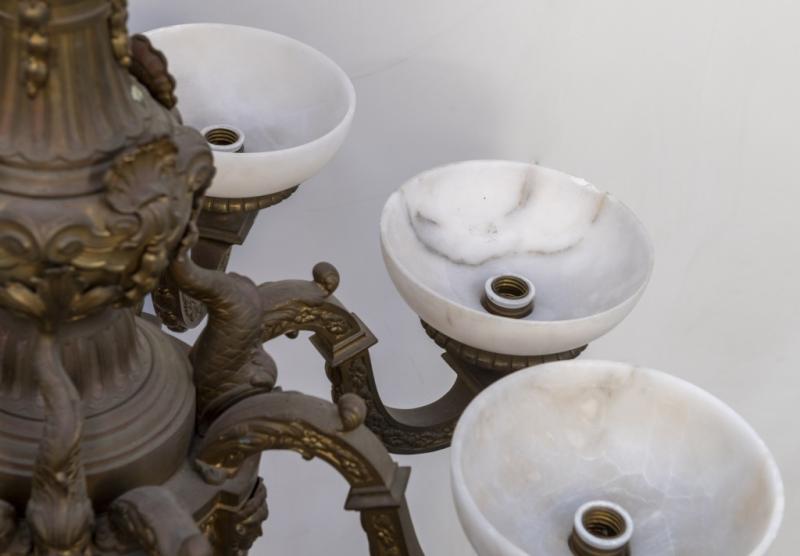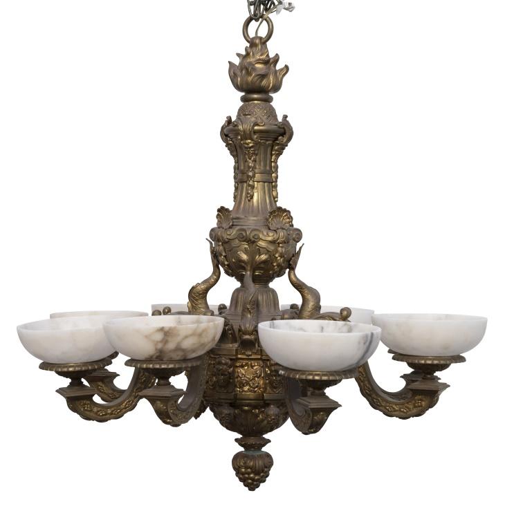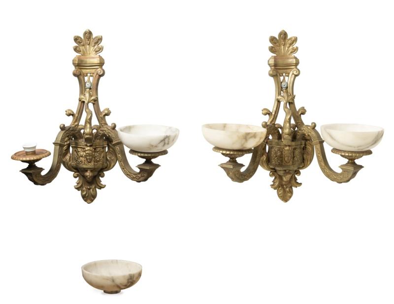 Lot 39 of 180: Louis XV style patinated and gilt bronze figural eight light chandelier En suite with pair of wall appliques, late 19th century