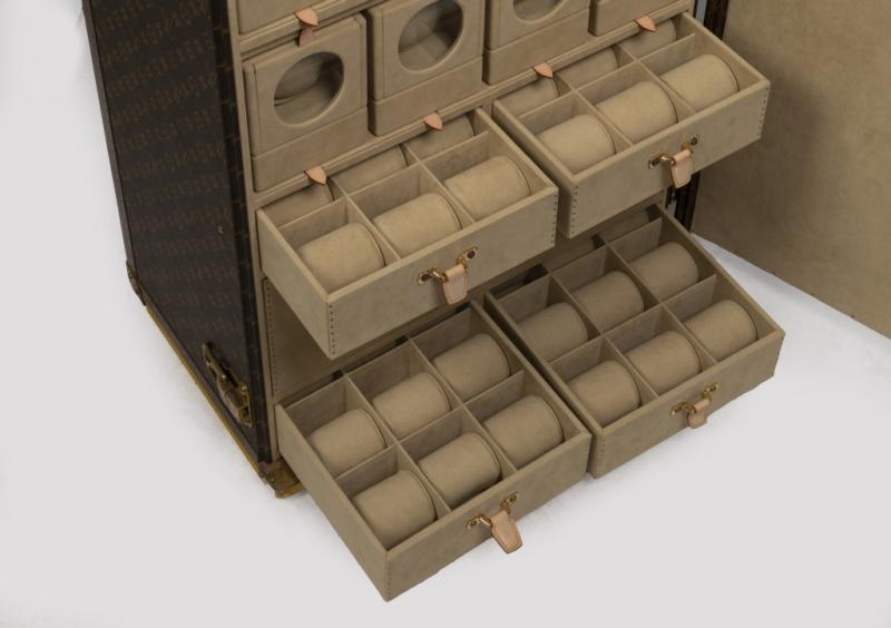 Lot 23 of 180: An exceptional special commissioned unique Louis Vuitton horologists watch cabinet, containing trays, drawers and 16 automatic winder compartments, sold with the original purchase receipt for $85,000 AUD, 143cm high