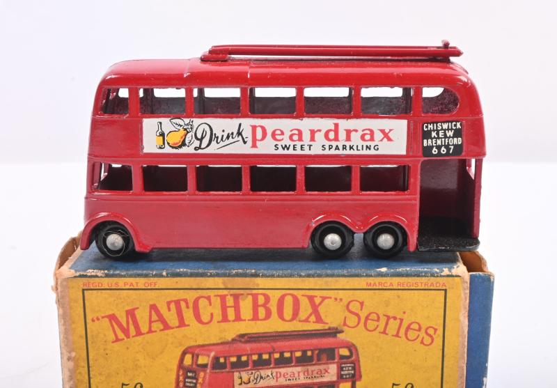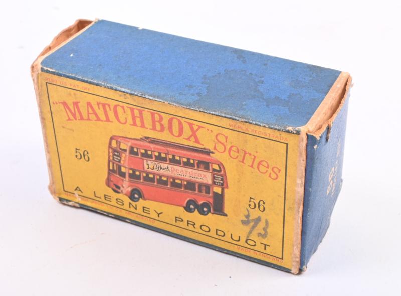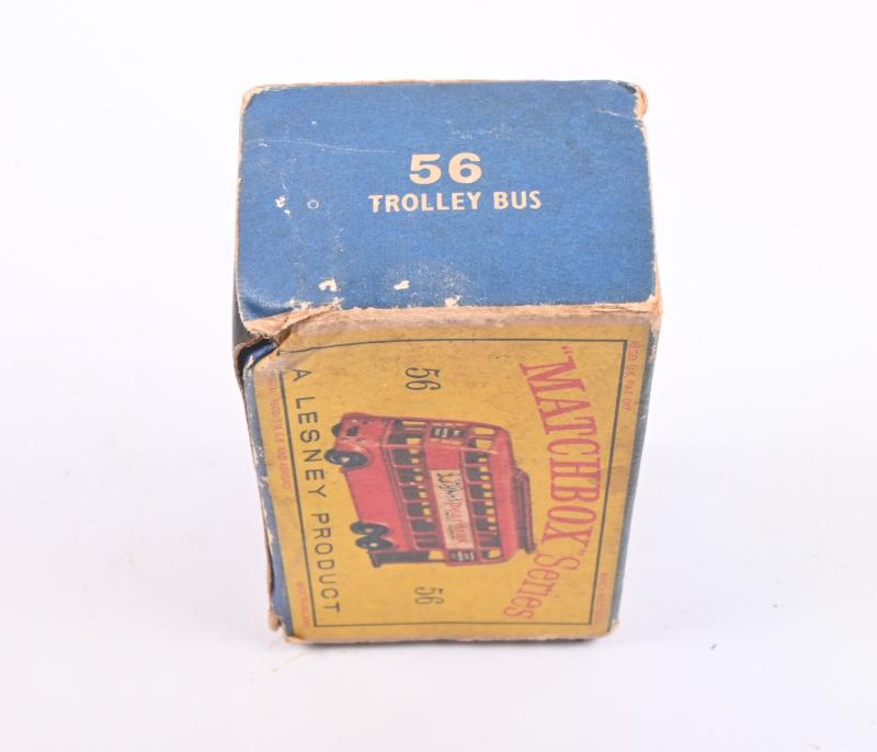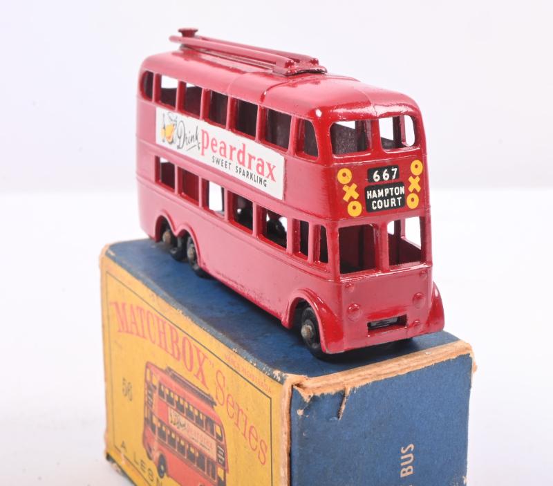 Lot 16 of 447: MATCHBOX: An early Matchbox No.56 Trolley Bus with Peardrax advertising on side, complete with original box. Made in England by 'Lesney'.