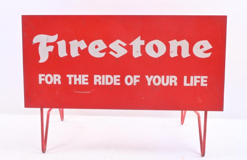 Lot 27 of 447: FIRESTONE: A c1970s original Firestone tyre rack, complete with stand, approx 38cm wide, 27cm high, 24cm deep.