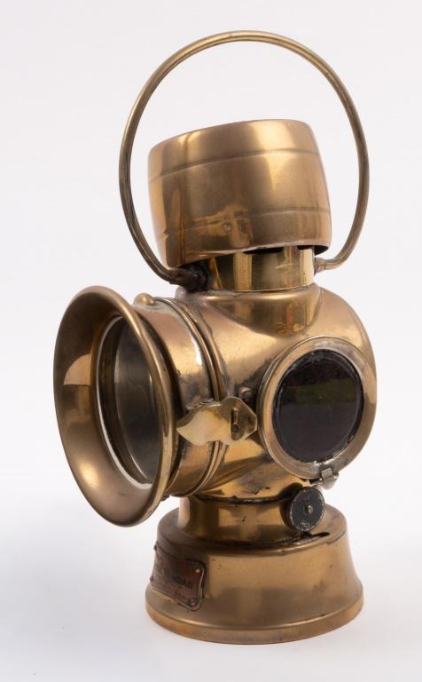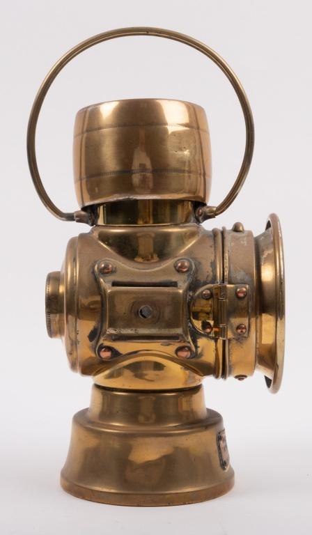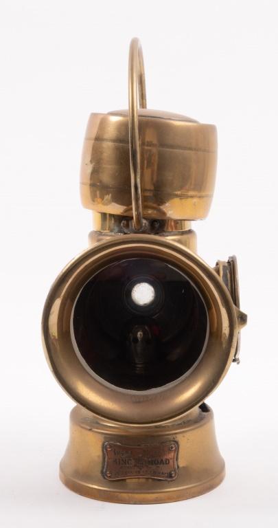 Lot 30B of 537: LUCAS: A fine Edwardian period brass Lucas 'King of the Road' No.634 kerosene side or rear lamp, two lenses, largest is clear, smaller is red, approx 27cm high, largest lens diameter approx 7cm
