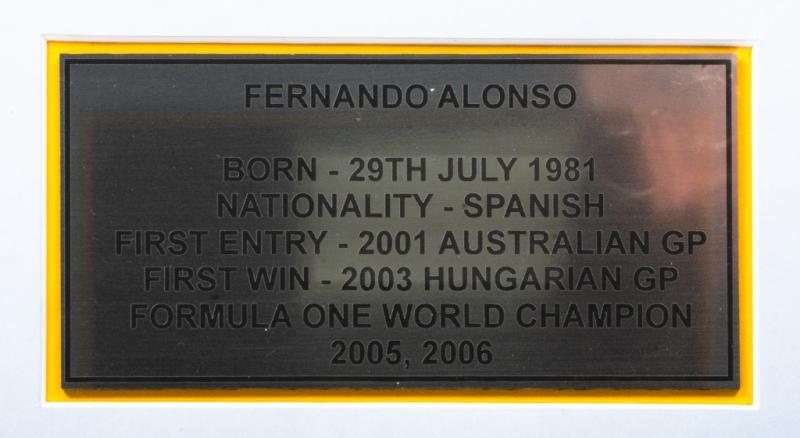 Lot 2 of 226: ALONSO: A box framed collage relating to F1 World Champion Driver Fernando Alonso, including Puma 'ING' racing glove with Fernando Alonso signature surrounded by four photographs and plaque. Measures 84cm wide, 59cm high.