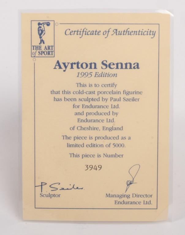 Lot 41 of 226: AYRTON SENNA: A 1:9 scale limited edition (3949/5000) cold cast porcelain resin figure of Ayrton Senna sculpted by Paul Szeiler for Endurance Ltd, on wooden base with engraved plaque, NIB and accompanied by a COA from The Art of Sport, 22cm high