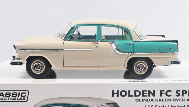 Lot 15 of 558: HOLDEN: 1:18 scale Classic Carlectables Olinda Green over Adobe Beige Holden FC Special Sedan, No 460 of 850, Certificate of Authenticity, boxed.