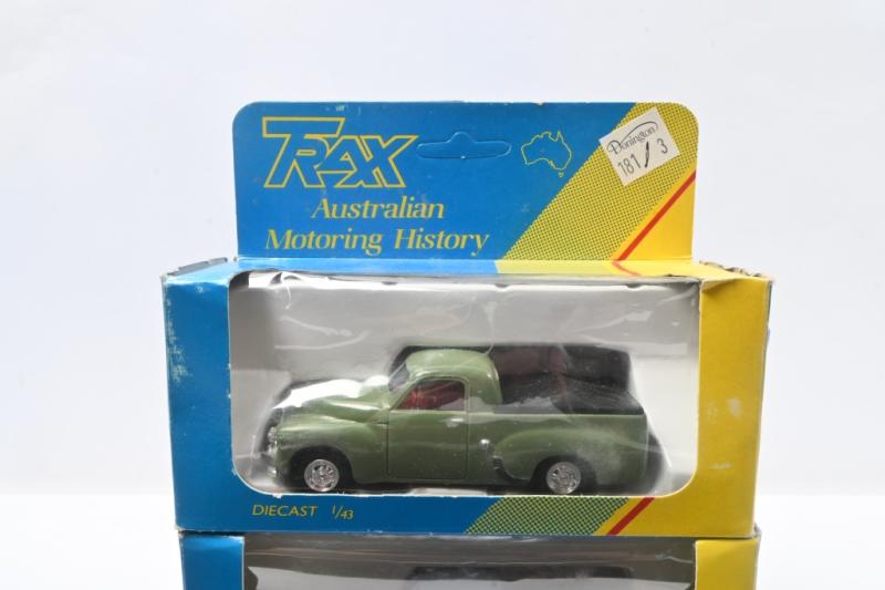 Lot 181 of 558: TRAX: set of 3 1:43 Trax "Australian Motoring History" series FJ Holden Utes, 1 Grey Trax 10th Anniversary Commemorative Edition with Black tonneau cover, 1 Olive Green with Black tonneau cover, and 1 Red Royal Mail with Beige tonneau cover, no Cs of A, all clear display boxed.