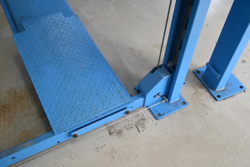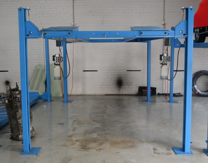 Lot 10A of 128: HOIST: A four post 240v hydraulic vehicle hoist 3600kg load capacity, complete with approach ramps and moving dollies. [Location: Mount Waverley]