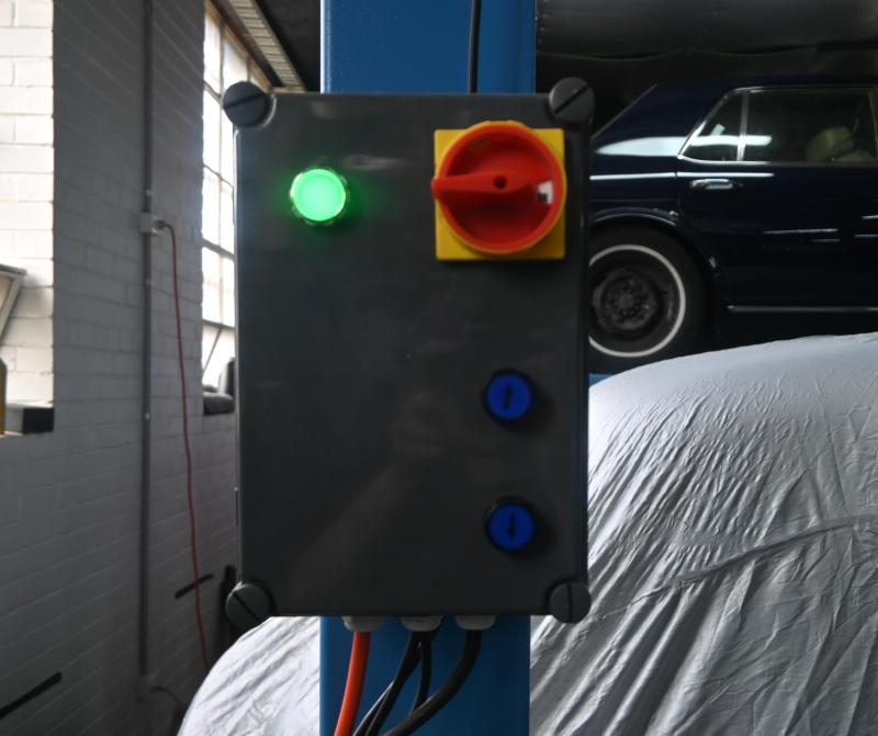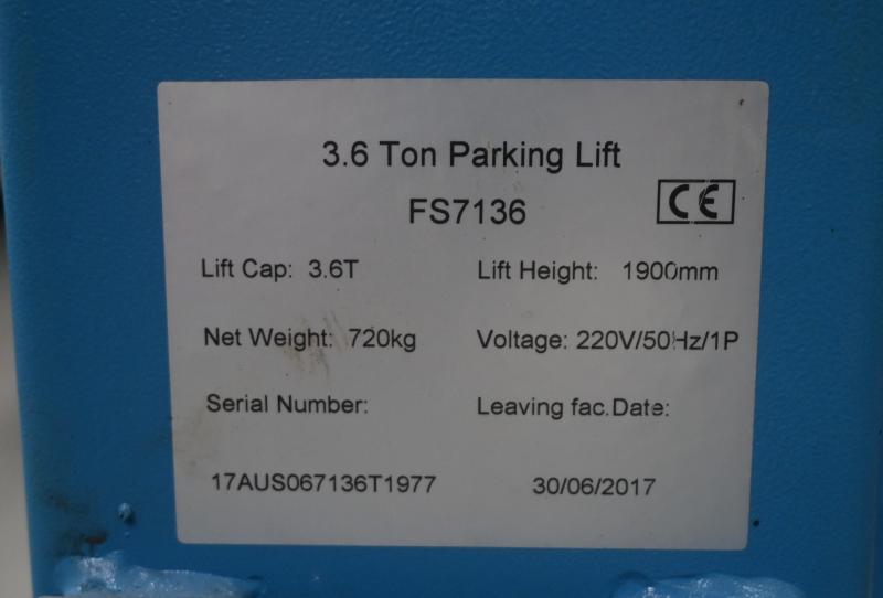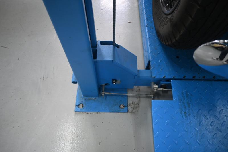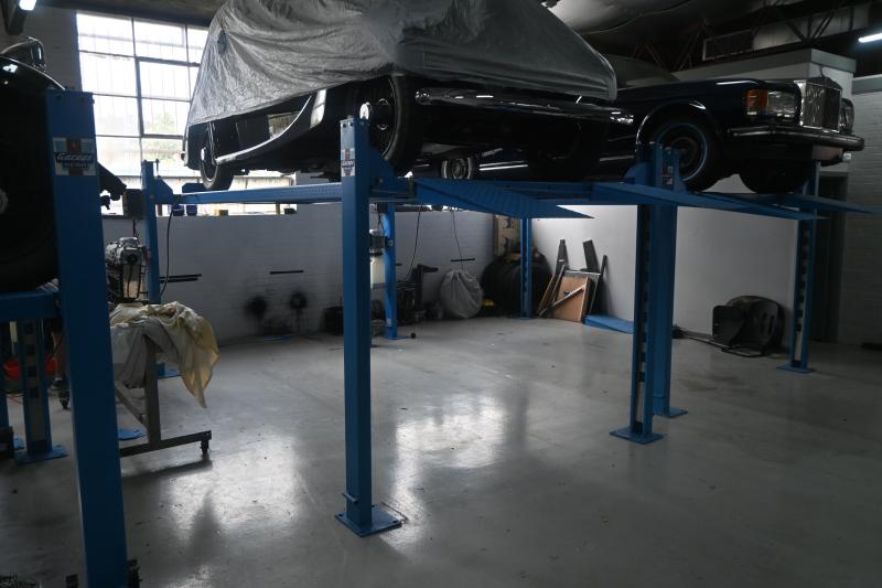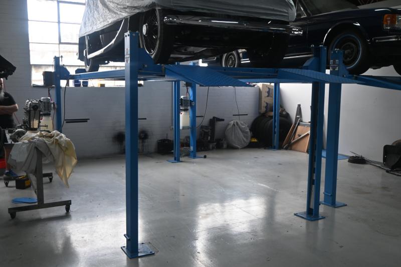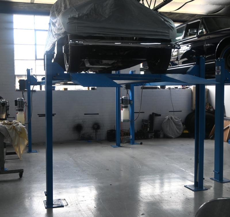 Lot 70A of 128: HOIST: A four post 240v hydraulic vehicle hoist 3600kg load capacity, complete with approach ramps and moving dollies. [Location: Mount Waverley]