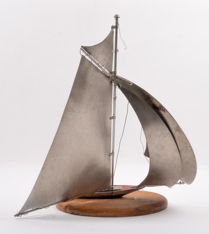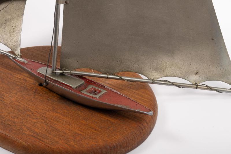 Lot 14 of 616: YACHT: A decorative 1950s metal yacht sculpture in full sail on a wooden base, some wiring detached, 37cm high, 38cm wide