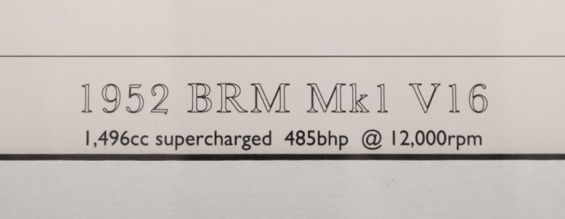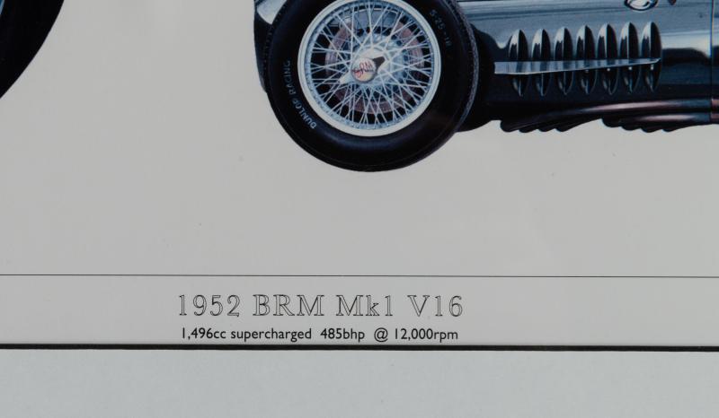 Lot 30 of 470: BRM MK1: A excellent limited edition print (27/250) of a 1952 BRM Mk1 V16 in cutaway style, by Tony Matthews, framed and glazed, 65cm wide, 49cm high overall.