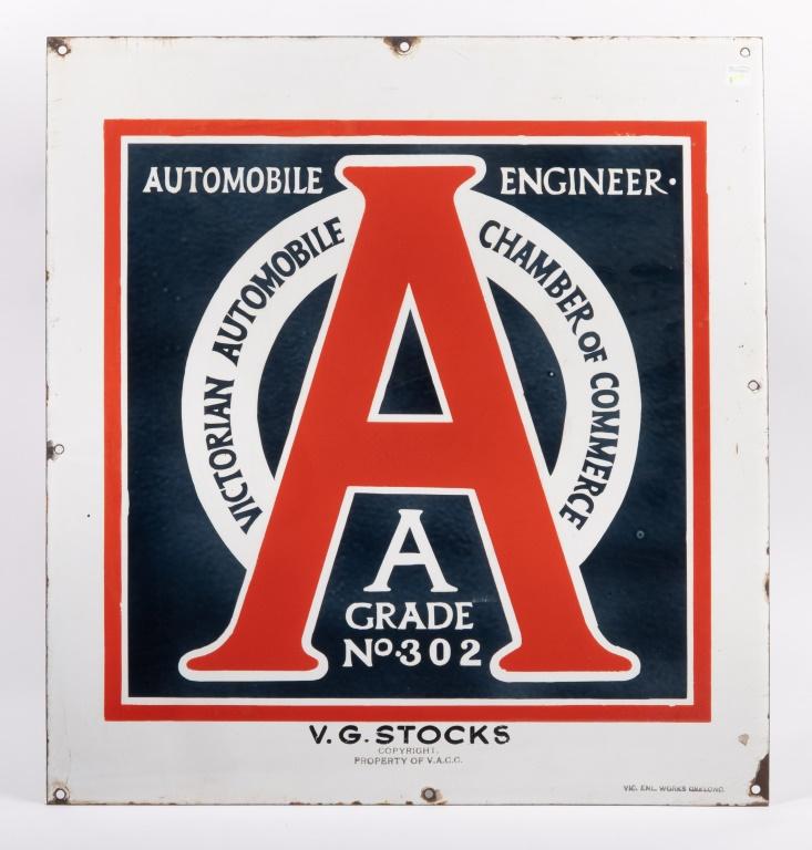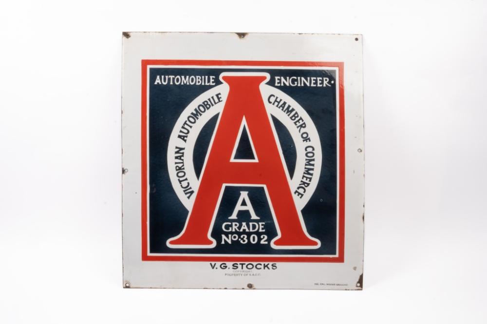 Lot 8 of 573: An original enamelled 'Victorian Automobile Chamber of Commerce' Automobile Engineer 'A' Grade member no. 302 workshop sign, 54.5cm wide, 58.5cm high